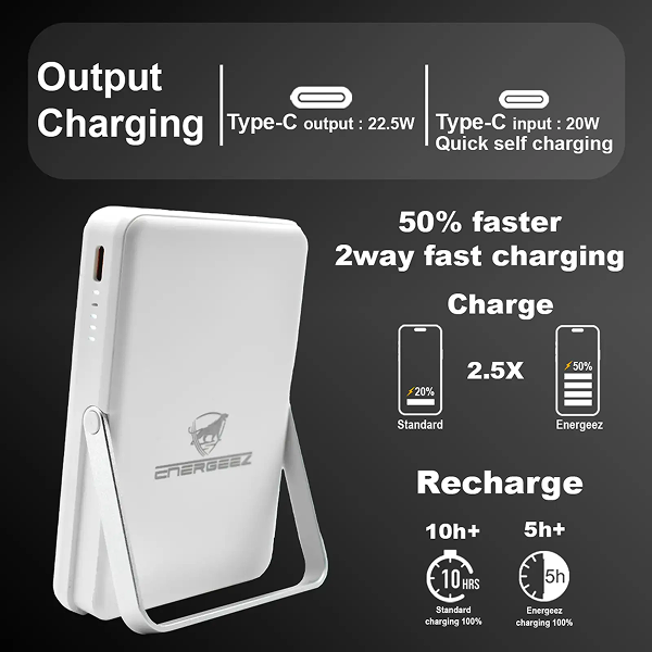 Energeez Zyon EZ_8000 power bank combines cutting-edge performance with a sleek, professional design, offering an exceptional charging solution for modern professionals. Key features include: 1. High-Capacity Battery: Equipped with a 10,000 mAh Lithium Polymer battery, providing reliable and extended power for multiple device charges. 2. Fast Charging: Type-C Port: Supports up to 22.5 W output for rapid charging of compatible devices, with dual input/output functionality for enhanced versatility. 3. Wireless Charging: Delivers up to 15W of wireless power, ensuring seamless charging for Qi-enabled devices. 4. Compact and Portable Design: Dimensions: 95mm x 65mm x 18mm, engineered for lightweight portability without compromising functionality. 5. Smart Features: LED indicators for real-time battery and charging status. Dedicated power button for efficient operation and energy management. 6. Durability and Elegance: Constructed with a robust, minimalistic design that complements a professional lifestyle while ensuring long-lasting reliability. Ideal for business, travel, or daily use, Zyon EZ_8000 provides a dependable and efficient power source for professionals seeking convenience and performance in one device.