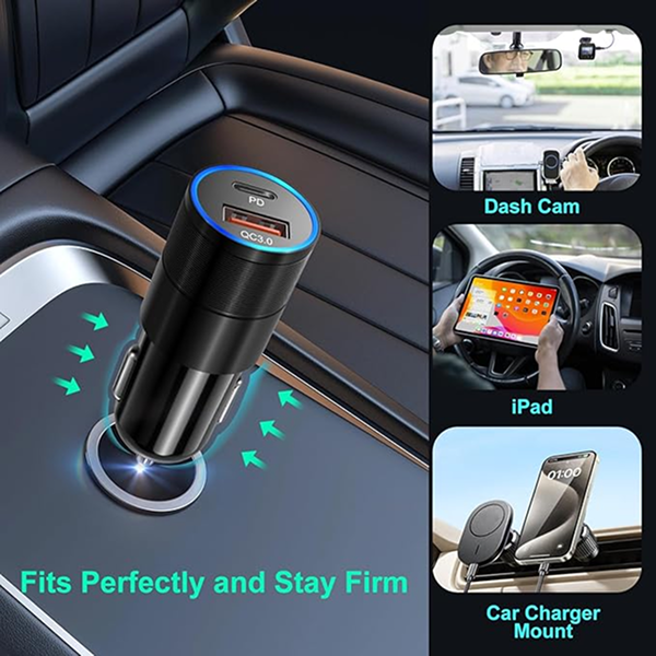 With our multiple times test, this usb c car charger can fits perfectly for most cigarette lighters. Smaller size with shrapnel snap-in design to keep your car neat and nice but won’t loose out easily. Aluminum alloy body enhance the durability and can protect your devices from overheating.